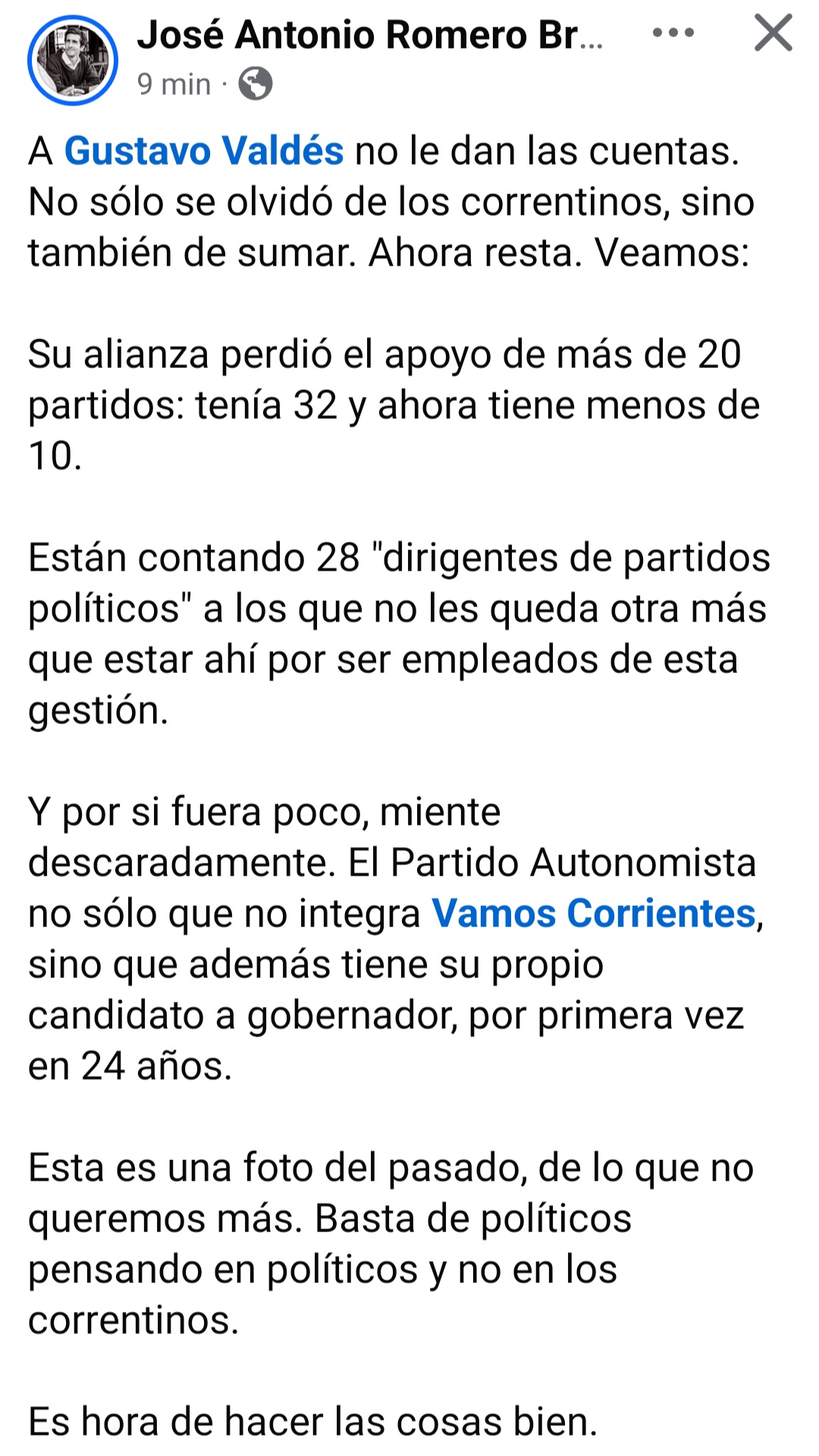 La política de corrientes vive horas de mucha tensión aún antes de conocerse la fecha de elecciones. Algunos candidatos se tiran dardos de mucho peso . Para el caso, el candidato a gobernador del Partido Autonomista José Antonio Romero Brisco acusó al mismísimo gobernador ,mayor referente del espacio Vamos Corrientes de mentiroso, cuando a través de sus redes sociales confronta con una publicación efectuada por Valdez,donde menciona que en la presentación de la alianza que encabeza la UCR en corrientes se incorporan más de 30 partidos . Romero Brisco No solo desmiente tal información sino que afirma que solamente ocho de los otrora 32 acompañantes de la unión cívica radical son los partidos que hoy están en esa alianza.